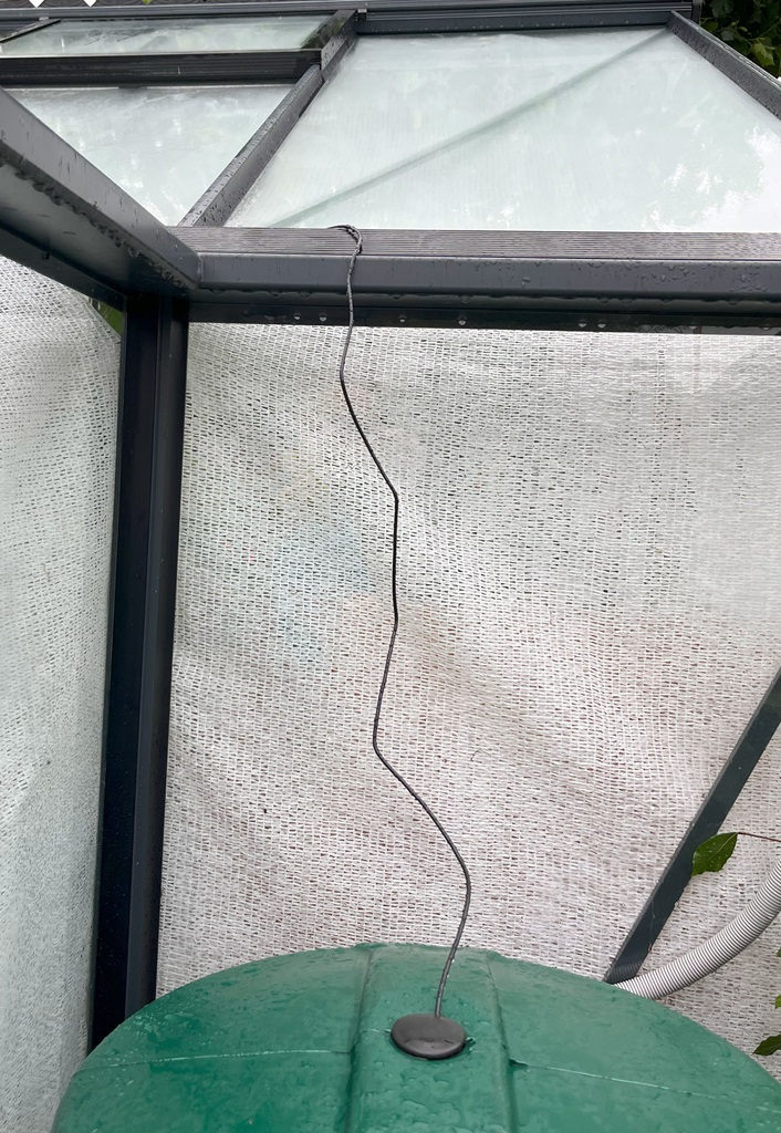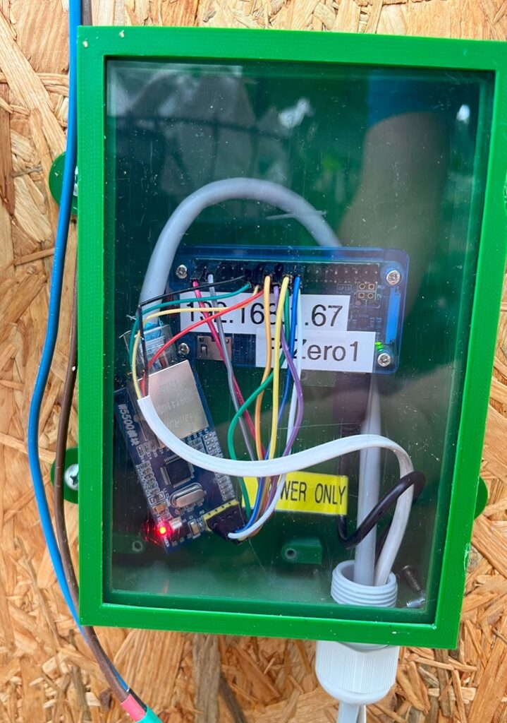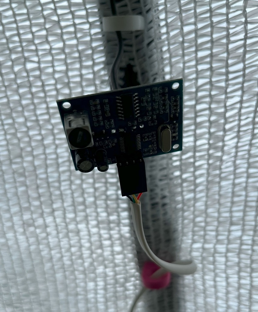 The sensor dangles down from the center of the lid. There was no crack to run the wire in because I put the green house together properly. The wire enters via the roof truss through the upper window. Inside is the PCB that controls the speaker and processes the signal. A four-wire telephone wire helps bridge the last meters to a Raspberry PI Zero Wifi that is connected to the fixed internet.